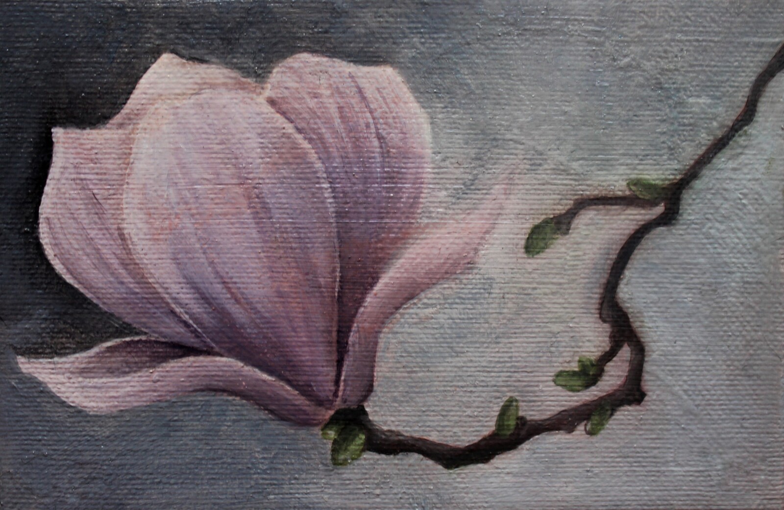 < Helena Kellerberg > Magnolia at Dawn Oil colors (5 W x 3 H x 0.7 D) This painting presents a magnolia blossom rendered in soft pink and lilac tones against a muted gray background. favorite